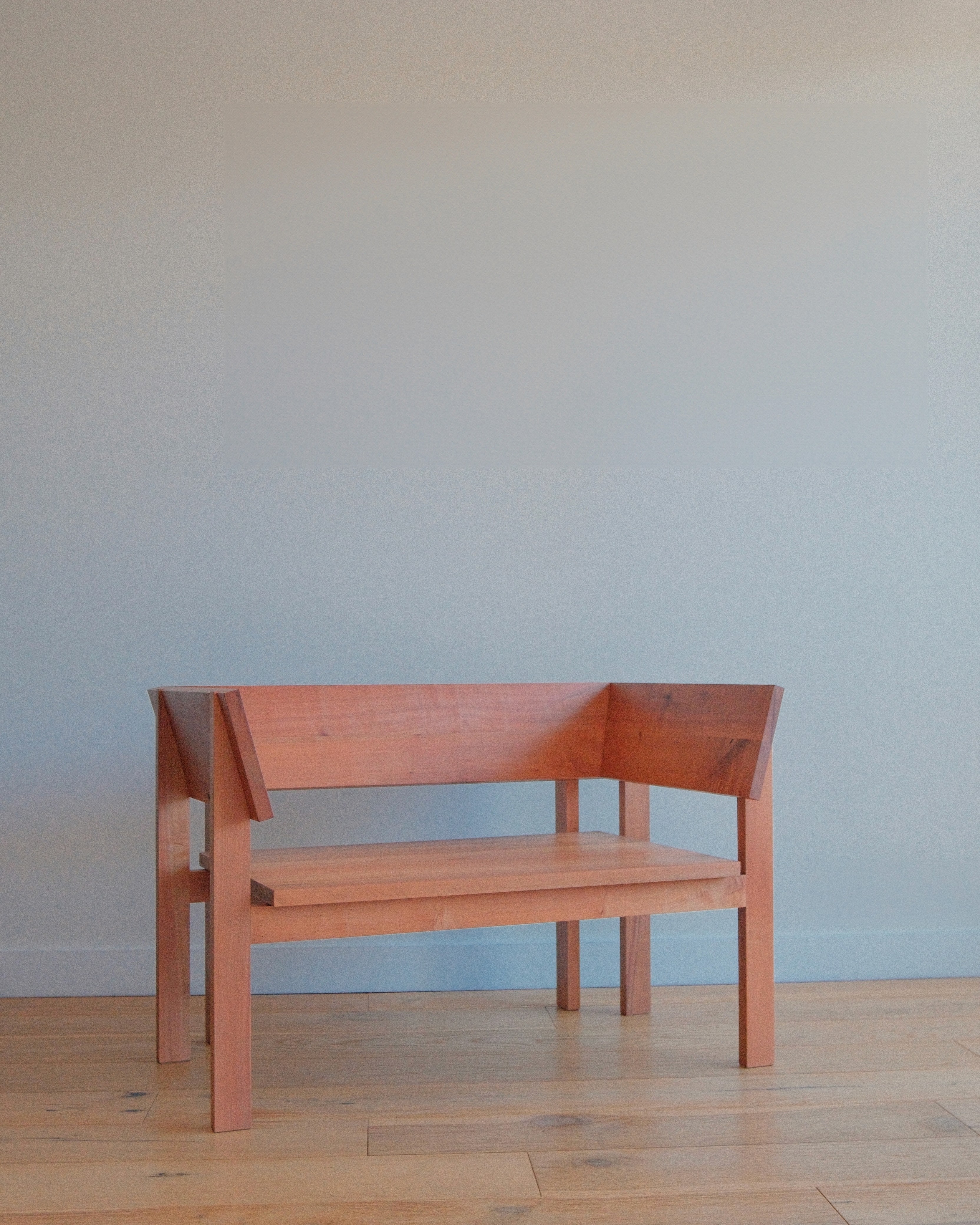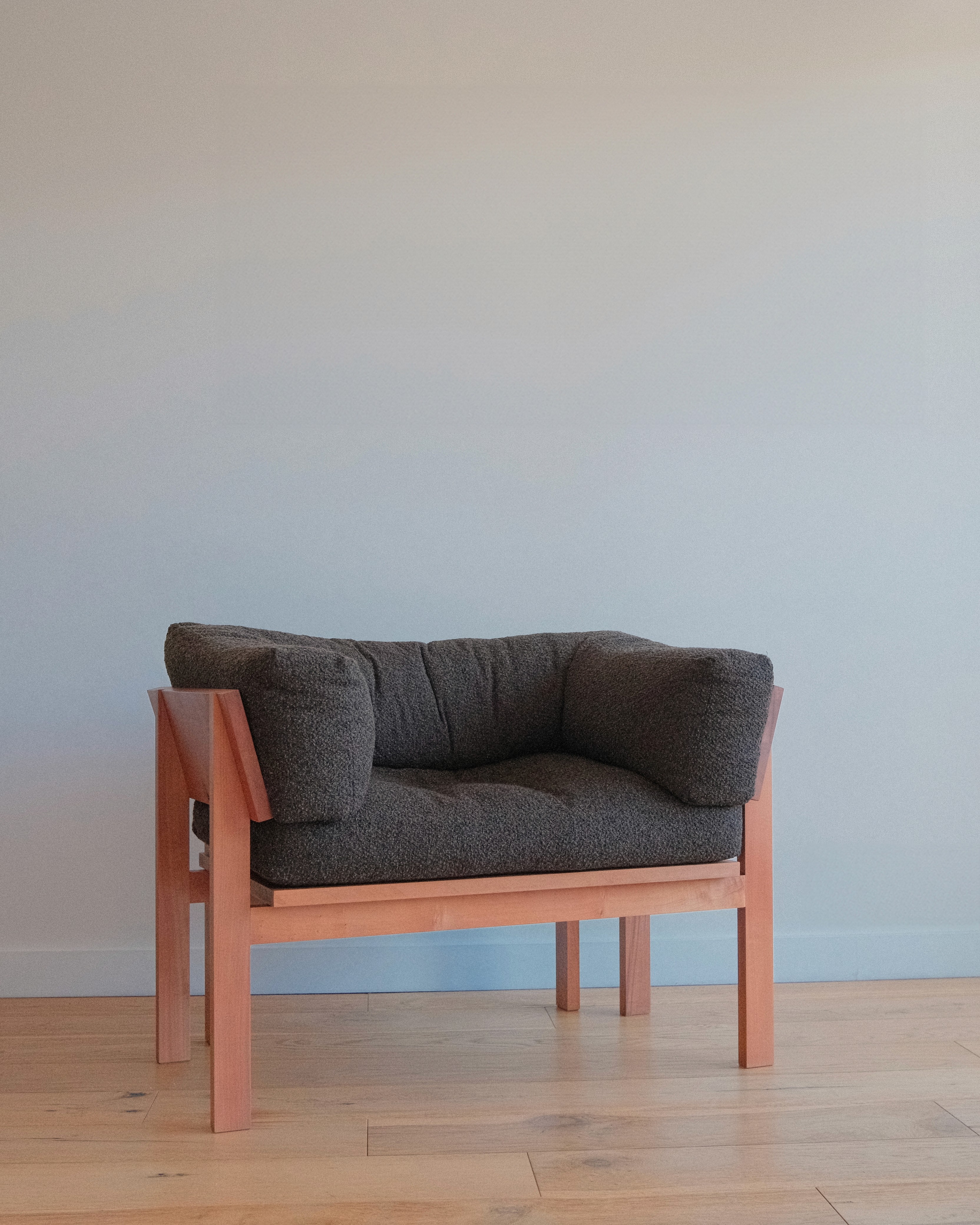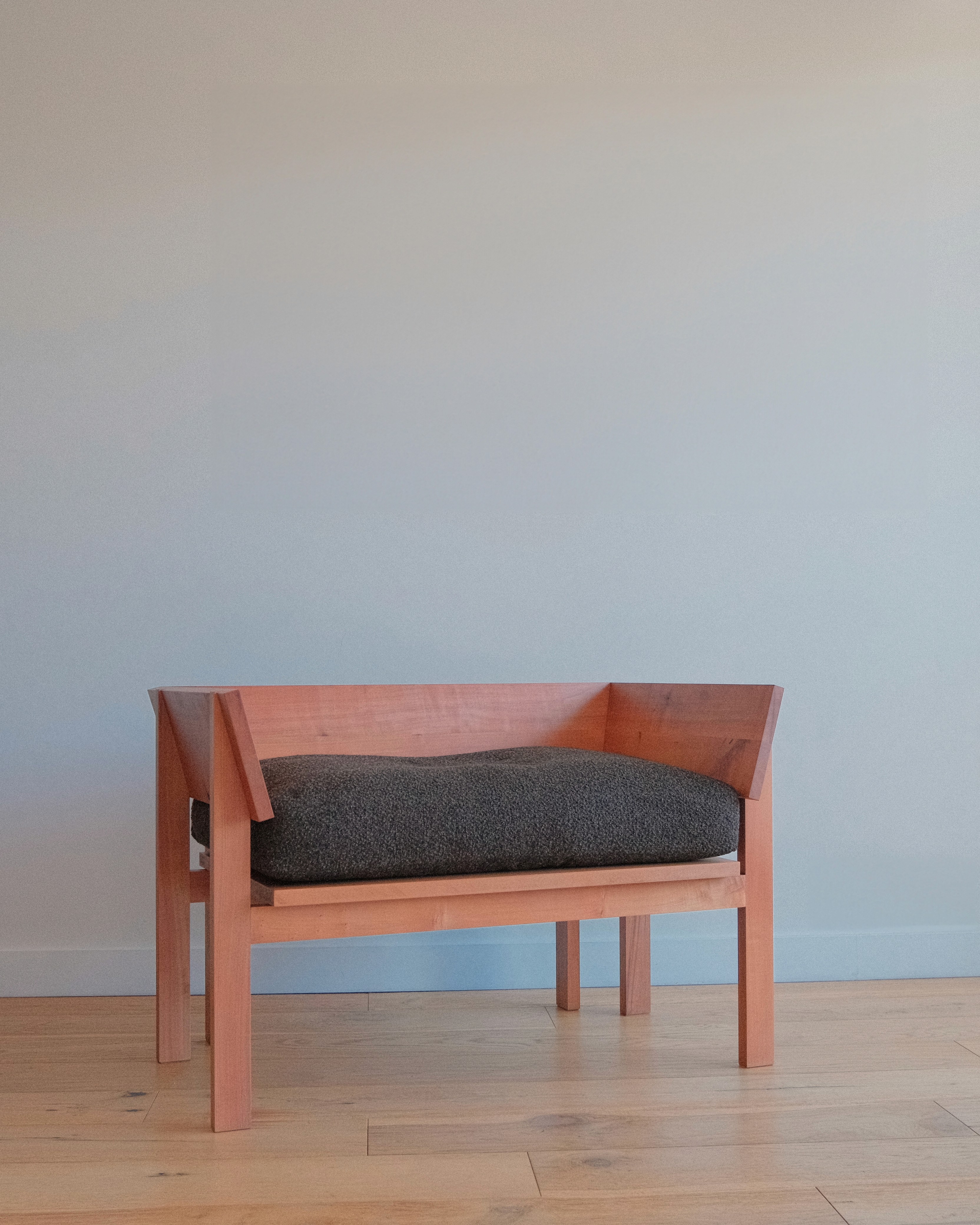 As a somewhat contemporary throne, this armchair is intended to reconsider ideas of comfort, push construction and challenge expected proportions. It reflects a commitment to slow design and thoughtful sustainability, using reclaimed Tasmanian myrtle to its limits and adopting recycled polyester upholstery* for its durability.